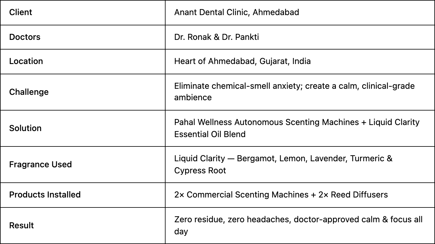 If you’re a dental professional, clinic owner, or healthcare facility manager looking to create a calmer, more welcoming environment for patients and staff – Pahal Wellness offers bespoke scenting consultations across India.